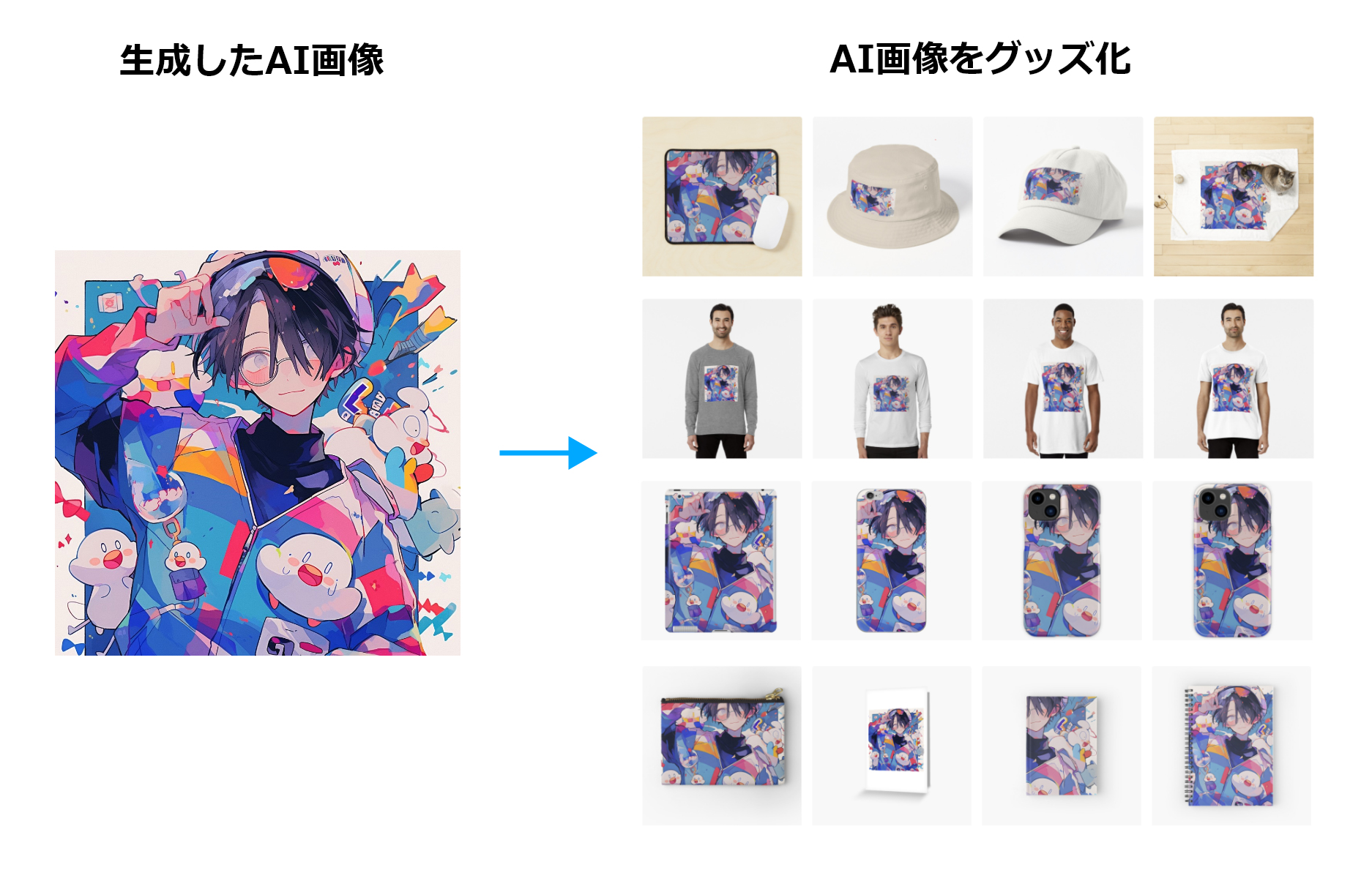 ③ プラットフォームでは、投稿したAI生成画像を様々な商品(Tシャツ、スマホケース、