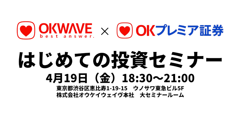 日本初、最大級のQ&Aサイト「OKWAVE」<https://okwave.jp>を運営する株式会社オウケイウェイヴ(本社:東京都渋谷区、代表取締役社長:松田 元)は、当社100%子会社で、本年4月1日に社名変更したOKプレミア証券株式会社(本社:東京都中央区、代表取締役社長:三日市 理、以下「OKプレミア証券」)の社名変更を記念した主催イベントとして、投資初心者向けのセミナー・イベント『はじめての投資セミナー』を2019年4月19日(金)に開催します。