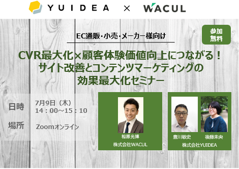 【7/9 オンライン開催】YUIDEA×WACUL 共催セミナー【EC通販・小売・メーカー様向け】 CVR最大化×顧客体験価値向上につながる! サイト改善とコンテンツマーケティング効果最大化セミナー