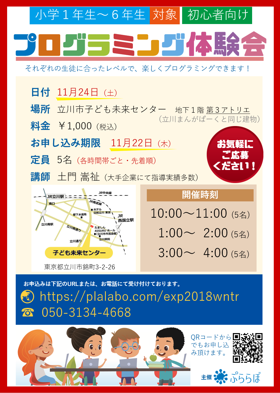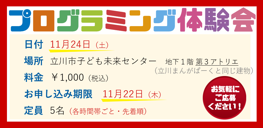 自宅からビデオチャットで学べる小学生・中学生向けプログラミング教室「ぷららぼ」を運営する株式会社ぷららぼ(本社:東京都立川市、代表取締役:土門嵩祉)は、11月24日(土)に東京・立川市の立川市子ども未来センター内で小学生を対象にした「プログラミング体験会」を実施します。