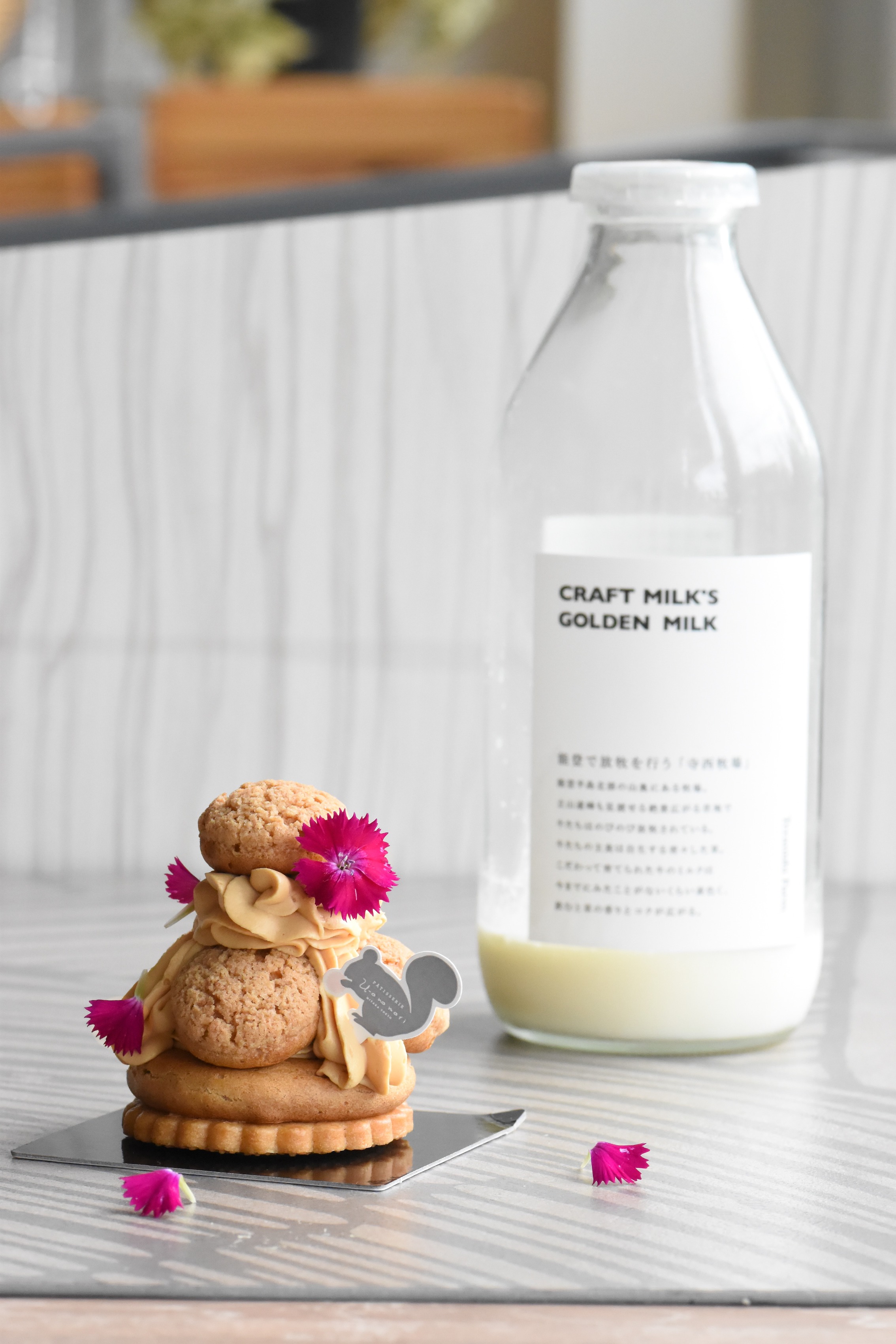 奥能登の山奥でわずか7頭のジャージーを放牧する「寺西牧場」のゴールデンミルクを使用。クリーム色でコクがあり、乳味感が豊かで、鼻から抜ける香りが能登の牧場の風景を連想させてくれます。大変希少な能登のゴールデンミルクを使ったミルクカスタードがこのケーキの一番のこだわり。あえてバターを加えずにミルク感を大切に。まずはミルクカスタードを味わっていただきたいので、上に乗っているシュークリームのみを召し上がれ。商品名の「能登オーレ」は、被災地 能登を少しでも応援したいという気持ちと、フランス語でミルクを意味するau lait(オ・レ)を掛け合わせました。地域に根差した洋菓子店として、シュー生地は地元の深大寺そば粉を使い、ほのかに香ばしいクッキーシューに。そばと相性の良いりんごを中心部に入れ、ほろ苦いキャラメルクリームで飽きることなく食べ進められるように工夫。地元の海老澤農園さんのエディブルフラワーで彩りを添えました。