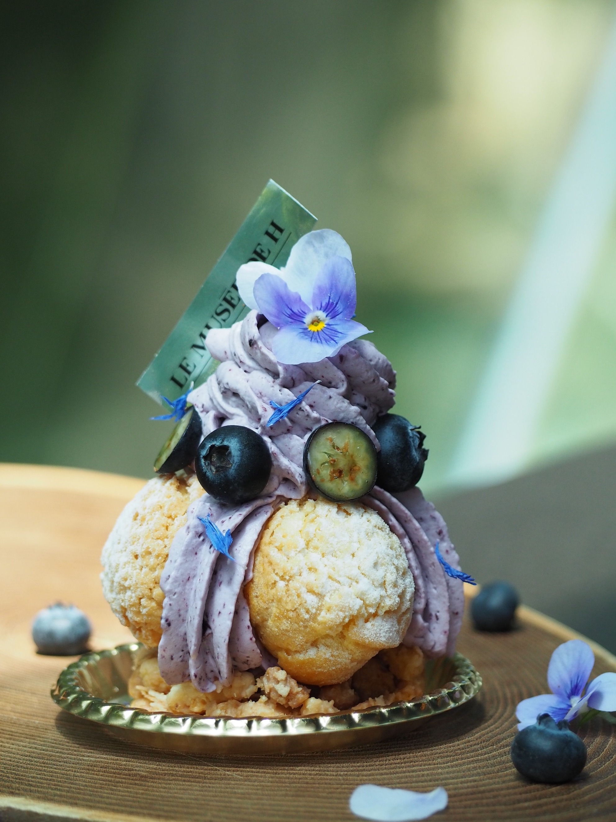 果実感や酸味のバランスが素晴らしい、石川県産の柳田ブルーベリーをクリームとコンフィチュールに仕立て、シューの中には琉球紅茶チャイのクリームを詰めました。チャイの奥ゆかしい香りやブルーベリーの果実感や酸味をバニラのクランブルが優しくまとめあげたサントノレ。