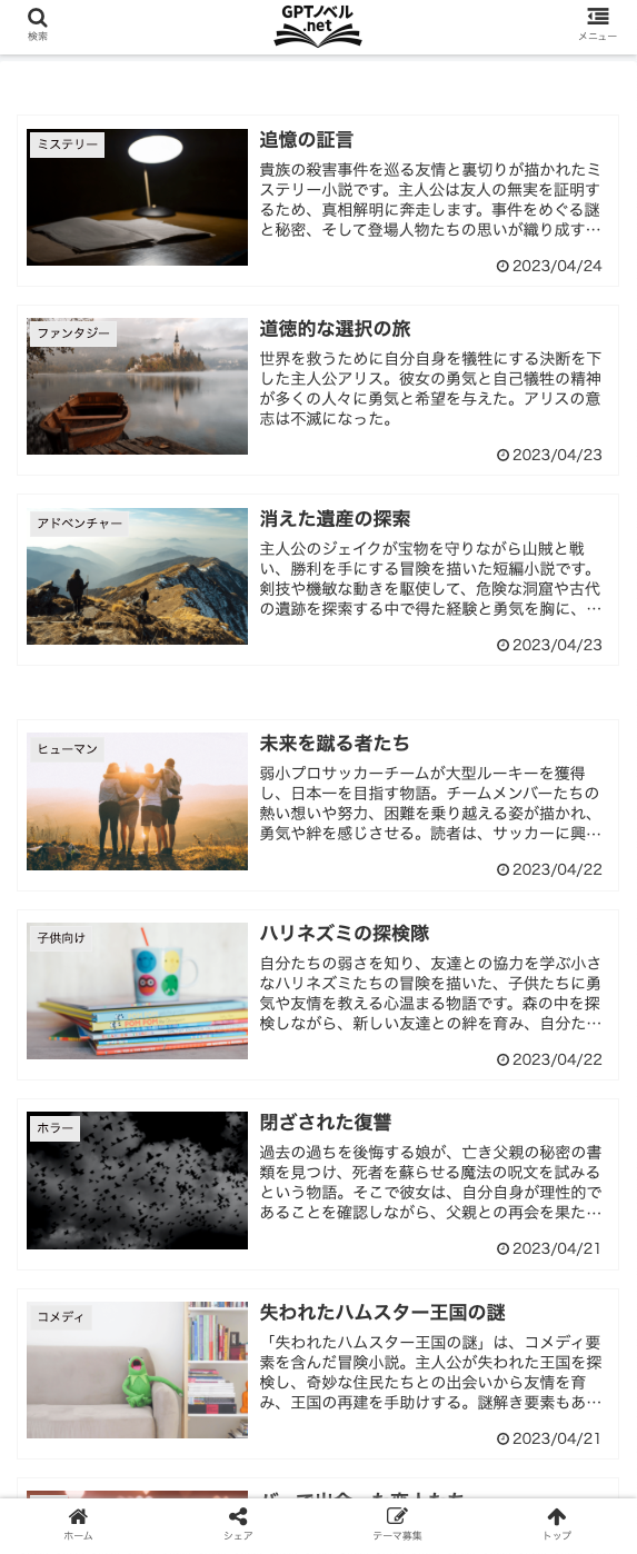 『GPTノベル.net』では、ユーザーの皆様からもテーマを募集しております。あなたが読んでみたい小説のテーマ、書いてみたいストーリーのアイデアなど、自由にご投稿ください。投稿いただいたテーマは、ChatGPTが自動生成した小説の中で採用される可能性があります。