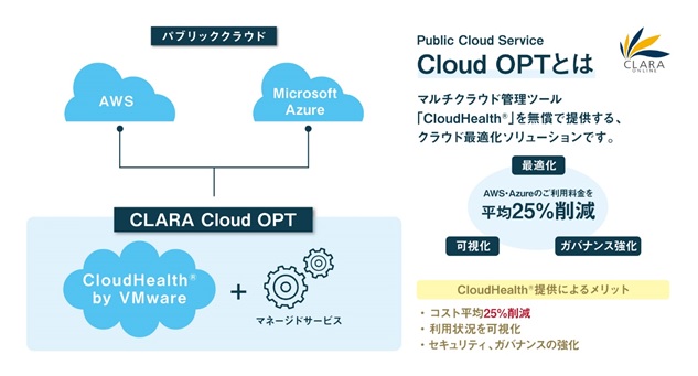 これにより、クララオンラインは、マネージドサービスを拡充するとともに、同社経由でのパブリッククラウド契約ユーザーに対して「CloudHealth」を利用できるアカウントとマネージドサービスをセットにしたクラウド最適化ソリューション「Cloud OPT」を提供いたします。