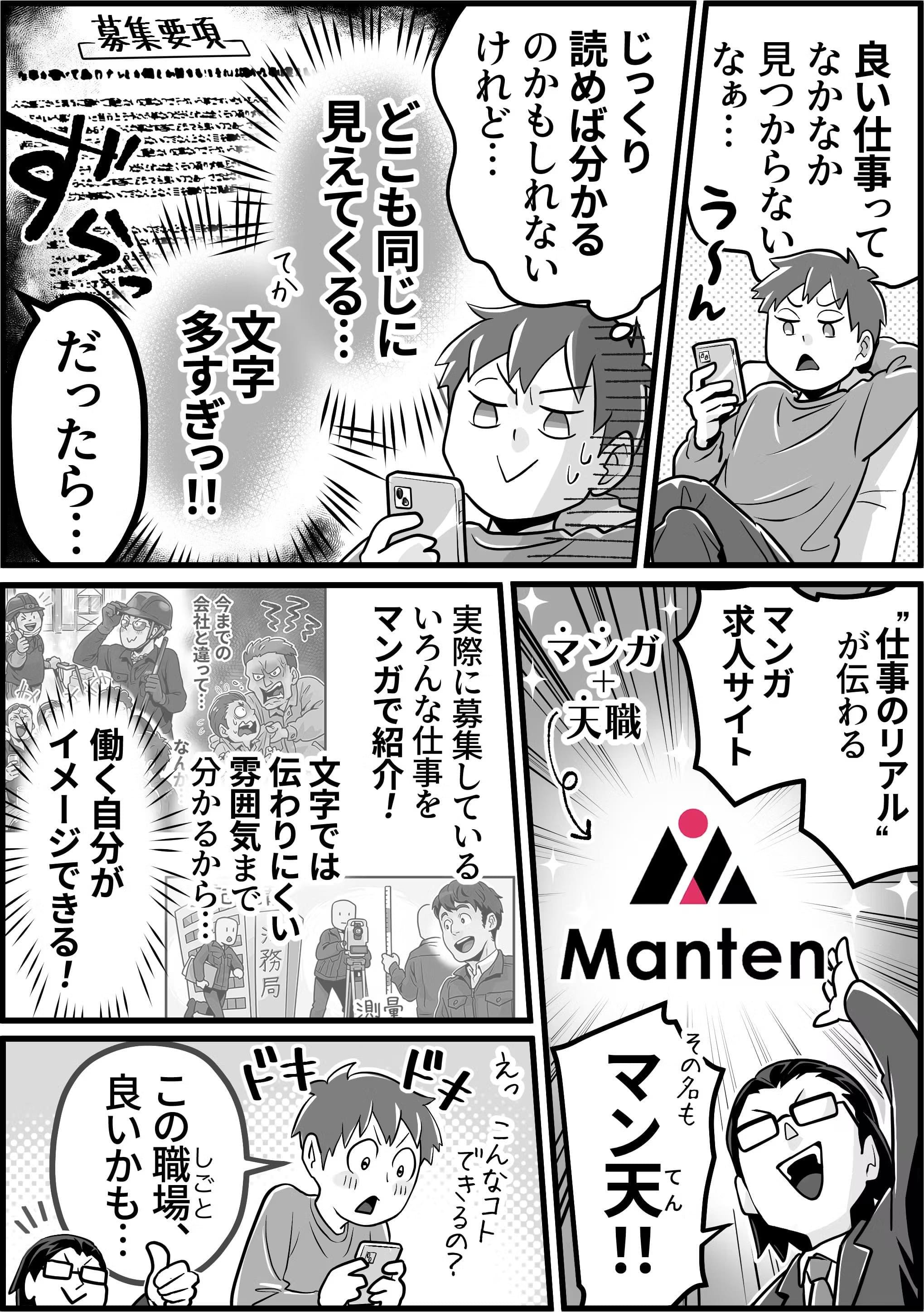 『マン天』は、求人情報をマンガ形式でわかりやすく伝え、応募者が“仕事を読む”から“働きを見る・感じる”体験へつなげるプラットフォームです。