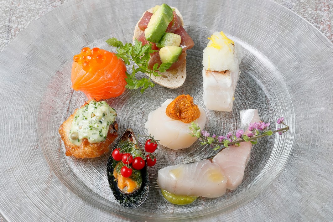 ① 前菜7種盛り合わせ(帆立のミキュイ雲丹のマリア―ジュ/鰆の瞬間スモーク木の葉味噌と/鯛の軽い炙り 柚子おろし/ムール貝の香草オーブン焼き/鮪とアボカドのブルスケッタ/蛸のフリット自家製タルタルソース/サーモンの小さな手まり寿司)