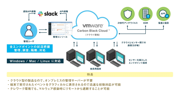 具体的な監視対象として、大学の事務業務で利用されるPC約160台を選定しました。今回のような取り組みでは、複数のセキュリティ製品同士が競合してうまく動作しないことも多くありますが、VMware Carbon Black Cloudはスムーズに既存の環境に導入できました。また、端末へのエージェント配布は、資産管理ソフトを利用して20~30分程度で完了しました。