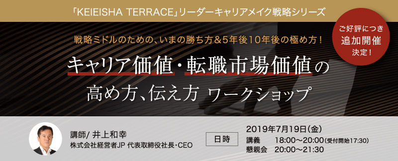 この度、株式会社 経営者JP(東京都渋谷区、代表取締役社長・CEO 井上和幸)が運営する会員制プラットフォーム「KEIEISHA TERRACE」(https://keieishaterrace.jp)では、前回開催時満席御礼、キャンセル待ちが続出したミドル・シニア層の幹部・リーダー各位及び、ミドル・シニア層の採用に携わる経営者・人事責任者向けに、「人物コンテンツ力」と「人物情報流通力」について、最新の労働市場、人材市場、社会トレンド情報も交えながら解説するワークショップを7月19日に追加開催します。