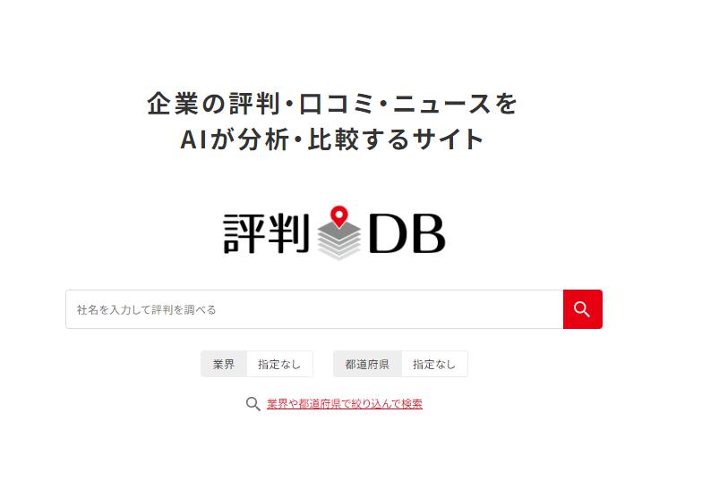 評判DBは、インターネット上に公開されている口コミやニュースなどの情報をAI技術で分析し、企業の評判をスコア化したサイトです。