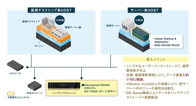 サーバー向け基盤は、同社の事業活動を支える約90台の業務サーバーを収容し、販売や物流、会計などの基幹系システムが稼働しているため、データ保護は非常に重要な課題です。また、VDI向け基盤では、約100台分の仮想デスクトップ環境を営業部門向けに提供しており、テレワークなどの働き方改革を促進するためにも、本社オフィスはもちろん、出先からのデータ活用のためには、セキュアな運用が不可欠です。従来、この2つの仮想環境のバックアップシステムでは、共有ストレージの筐体内にバックアップデータを保存していたため、ランサムウェアなどによる被害が懸念されました。また、リストア作業に手間が掛かる点なども課題になっており、より安全で効率的なバックアップ環境を整備することになりました。