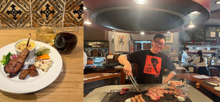 「下町バルながおか屋」では豪快に炭火で焼くラムチョップ、チーズテリーヌ、モルーノ(肉のグリル)、スパイシー煮込み、ピクルスなどの盛り合わせに、ワイン(赤・白・泡)などがセット