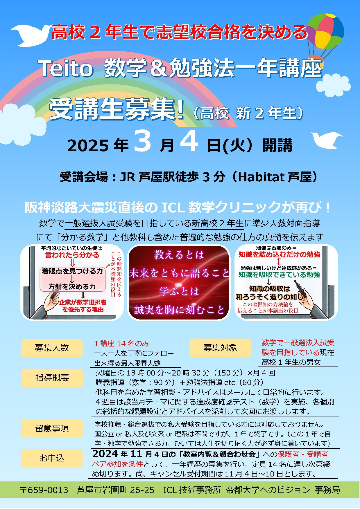 「帝都大学へのビジョン」でお馴染みのICL技術事務所は「高校2年生で志望校合格を決める!」ための【teito 受験数学&勉強法一年講座】を2025年3月に開講するにあたって、受講生の募集を開始いたします。