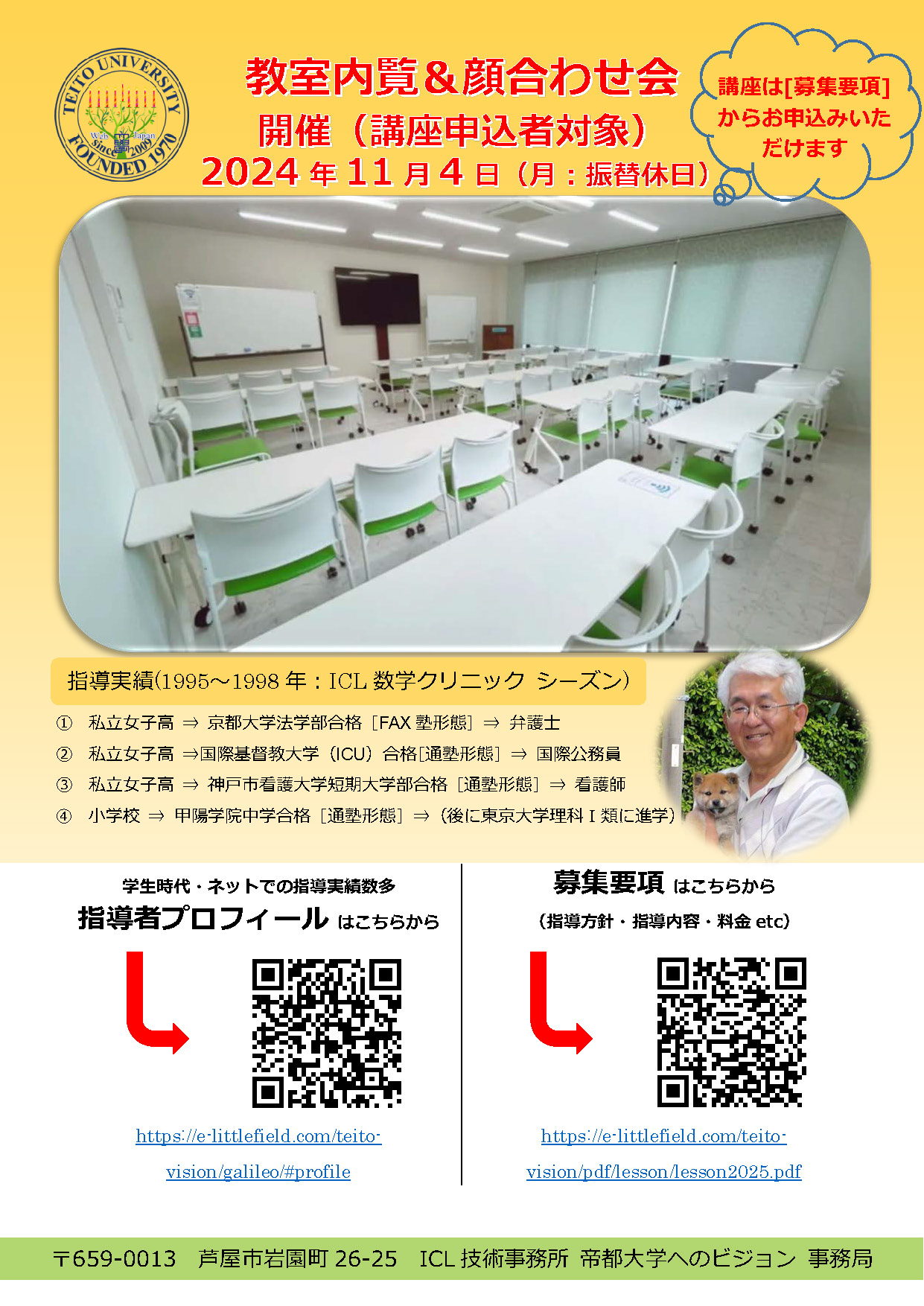 阪神淡路大震災後に運営し、少数ですが高校1年生を大学受験(当時は入試問題の難易度が最高レベルであった最後の時期)合格に導いた「ICL数学クリニック」(1995~1998年)。