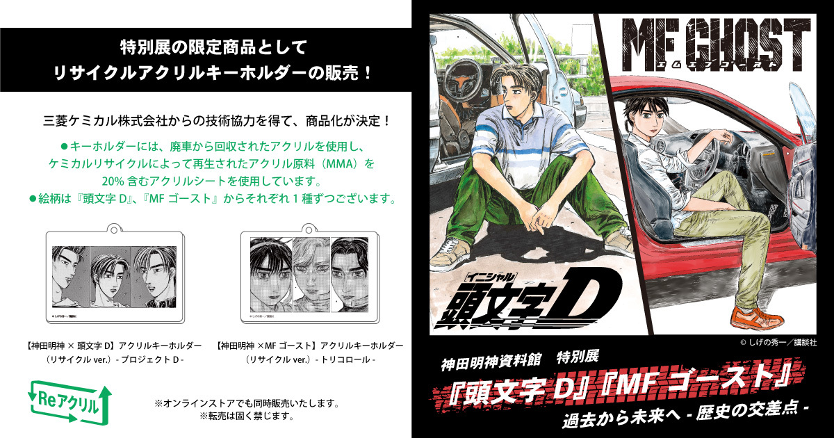2025年7月に開催された「人とくるまのテクノロジー展2025」の三菱ケミカル株式会社の出展ブースでは、自動車の使用済みテールランプを再生して作られた「サステナブルPMMA」の板材を用いた『頭文字D』の展示やノベルティキーホルダーが来場者の高い評価を得ました。この展示を通じて、車との高い親和性が確認されたことから、三菱ケミカル株式会社の技術協力と素材提供により、車をテーマとした人気コンテンツである『頭文字D』『MFゴースト』のグッズ商品化が実現し、一般発売に至りました。