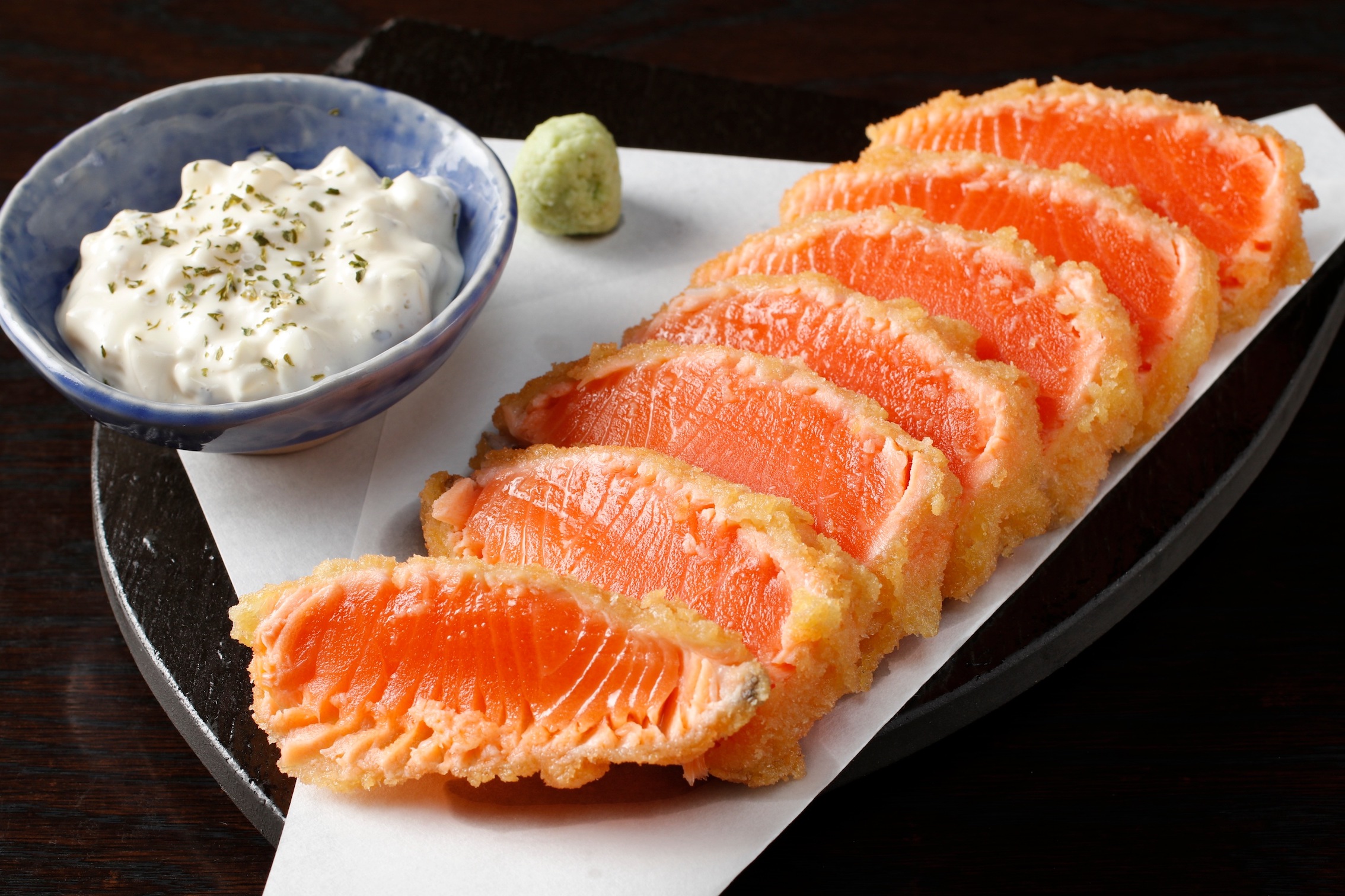 「サーモンレアカツ」1,078円。厚切りサーモンのカツは絶妙な火加減で調理。中はレアでジューシー