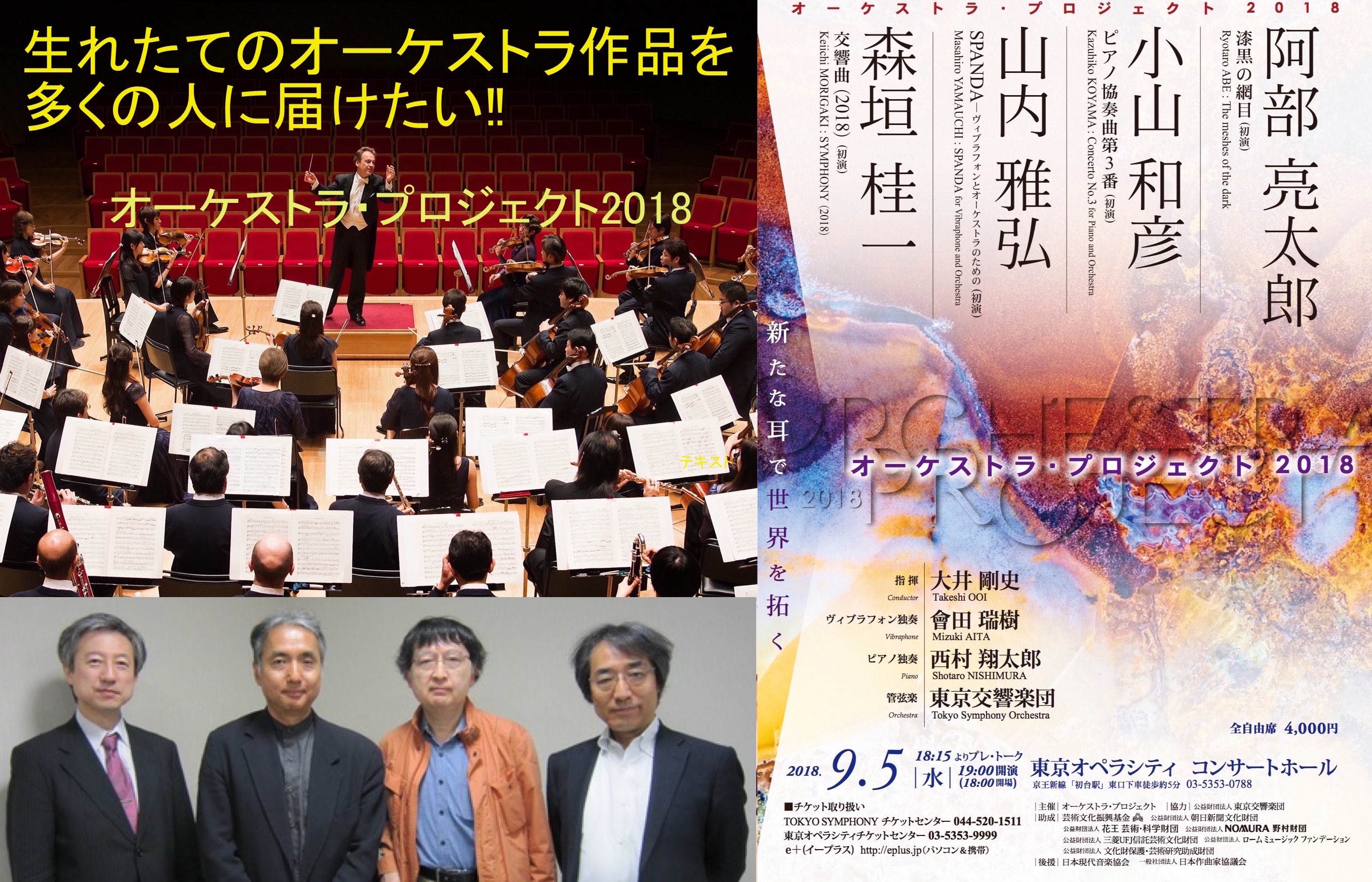 プログラム: 阿部 亮太郎、小山 和彦、山内 雅弘、森垣 桂一ら4人の作曲家による新作オーケストラ曲の世界初演。