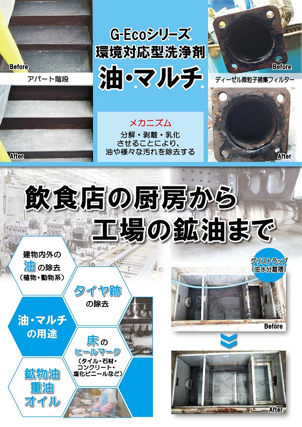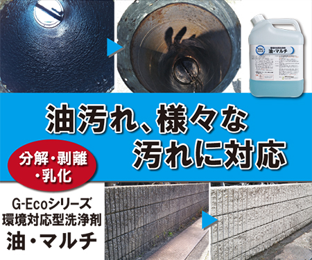 G-Ecoシリーズ環境対応型洗浄剤油・マルチは、厨房の油汚れから工場の鉱物油まで1本で対応!