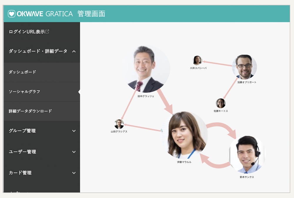 このたびのアップデートによる『OKWAVE GRATICA』のデータ分析機能を通じて、導入企業の管理者は管理画面上から従業員同士の“ありがとう”のやりとりの量をひと目で確認できます。管理職、スタッフ別での使用状況や1人あたりの平均送信数のグラフ表示、送受信数のランキング、コミュニケーション量のソーシャルグラフ化など、直感的なデータ分析が可能です。組織マネジメントの側面において、上司からコミュニケーション不足な部下への的確なタイミングでのフォローを促進し、従業員のモチベーション向上等の組織力の強化に活用できます。また、昨今のコロナ禍におけるテレワーク化など職場環境の変化による従業員の孤立感の抑止等、モチベーション維持向上に関わるメンタルケア、さらには人事配置や組織構成の参考データとして役立てることもできます。