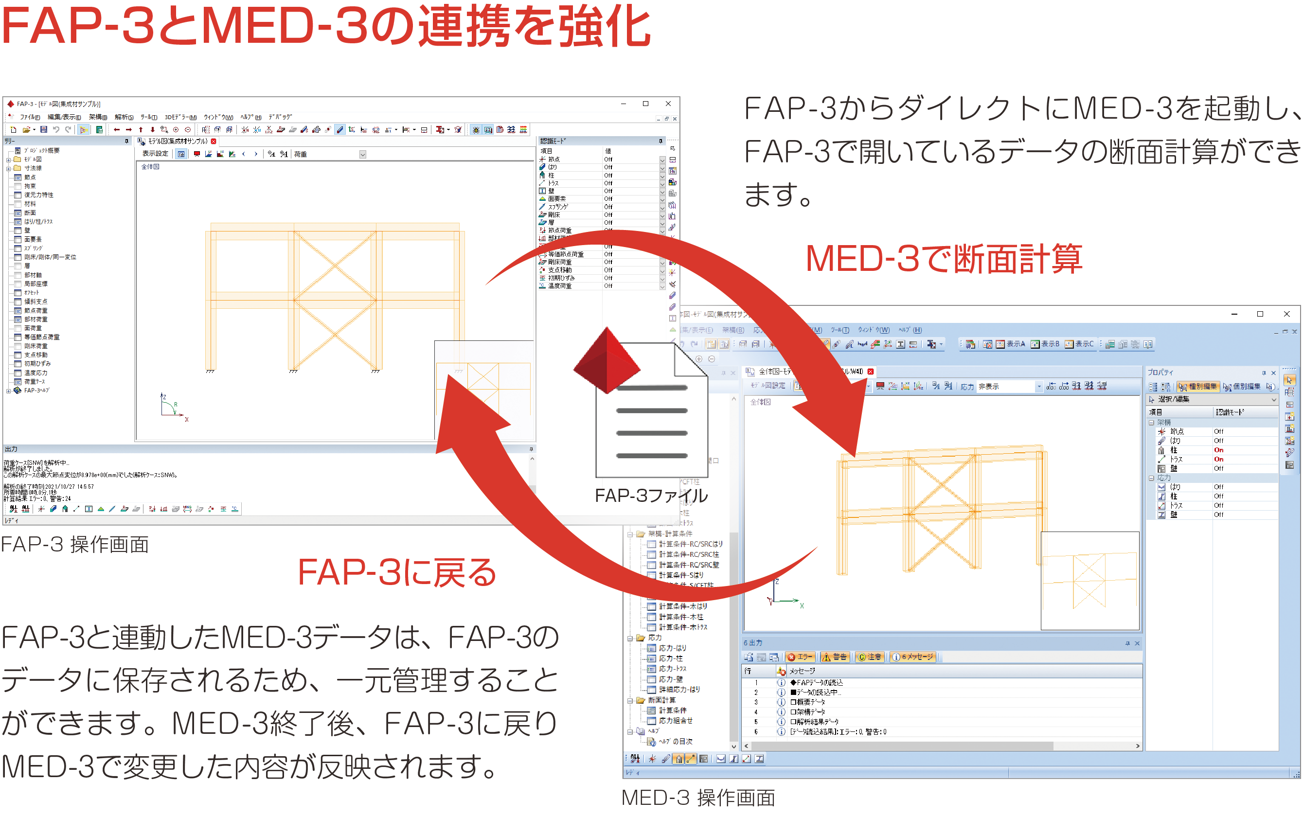 FAP-3は、立体フレームや立体トラスなど、線材(部材)と平面板要素で構成された任意形状立体フレームの弾性応力解析を行うソフトです。MED-3は、建築実務で一般的に使用される諸基準に準拠して、RC/SRC/S造ならびに木造の断面計算を行うソフトです。FAP-3で作成した部材断面と解析結果の応力に関するデータをMED-3に渡して断面計算をすることができます。