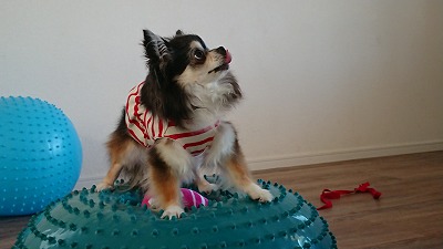 犬のバランスボール:本来はリハビリの目的で取り入れられたバランスボール。私たちが行うのは、日々の生活のQOLを上げるため、健康であるけれども、筋肉の強化をしておくために行います。バランスボールに乗ることにより、体幹を鍛え、立つ、歩く、走るなどに必要な筋肉の強化をお手伝いします。(けがをした、手術をした犬たちに関しましては、獣医さんとの連携が必要となってきます)