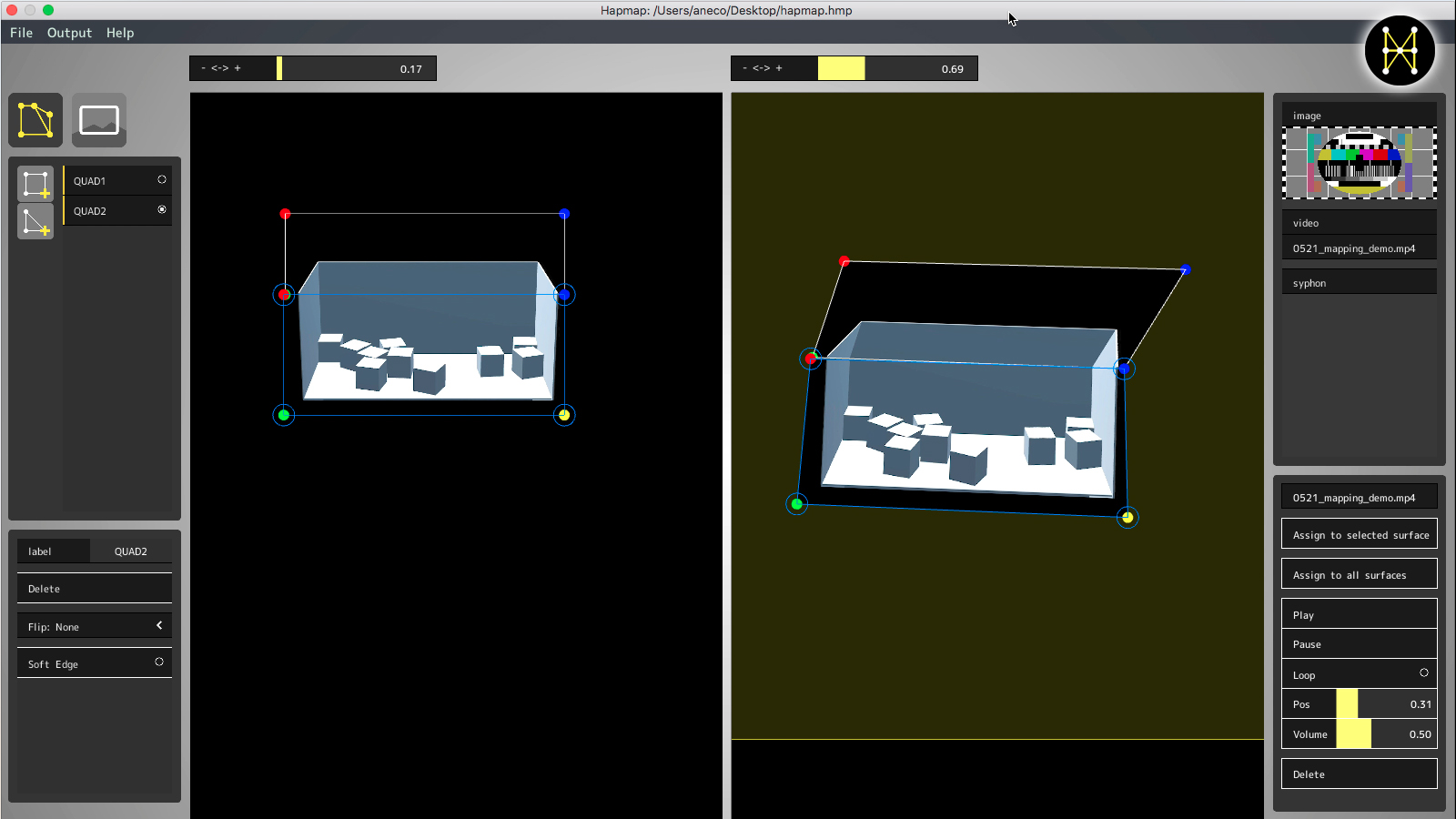 プロジェクションマッピングは近年、広告やアート作品、アトラクションなどのエンターテインメントを含め幅広い用途で活用されています。そんな中、使われているプロジェクションマッピングの投影補正ソフトウェアは、非常に多くの機能を備えたハイエンドなツールが大半であり、実際に使用する機能は僅かであるにも関わらず、高い導入コストを払わなければならないという問題がありました。Hapmapは、機能を最低限に絞ることにより、導入コストを抑え、より多くの人に、手軽にプロジェクションマッピングを楽しんでもらうことを目的に開発されました。
