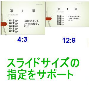 パワーポイントファイルの結合や分割等のパワーポイント処理を便利にする無料ツール集がバージョンアップ。スライドサイズを16:9/4:3を指定できるようにしました。