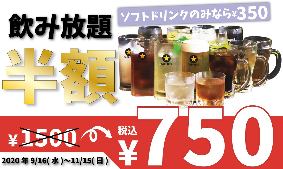 2時間飲み放題半額750円キャンペーン