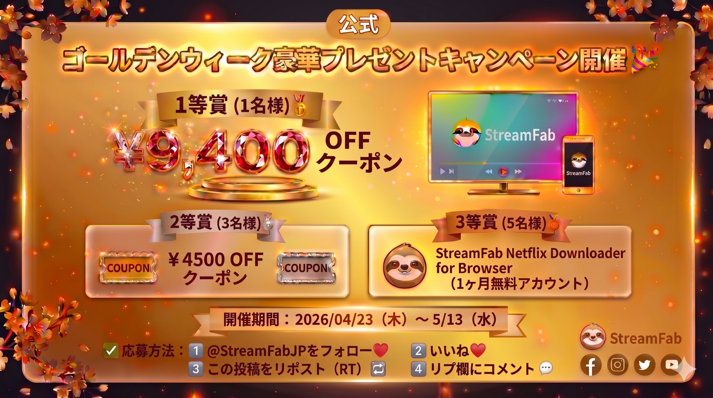 StreamFabは、より多くの日本のファンにこの利便性を体験してもらうため、2026年4月23日から5月13日まで、豪華賞品が当たるX(旧Twitter)キャンペーンを開催します。