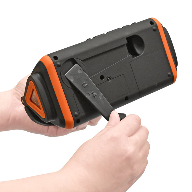 3通りの充電方法により蓄えた電力で、ラジオ放送の受信、スマートフォンの充電や、懐中電灯、SOSアラームと、コンパクトな本体に、もしもに頼れる機能が満載。付属のケーブルを接続してオーディオ機器のスピーカーとしても使用出来ます。