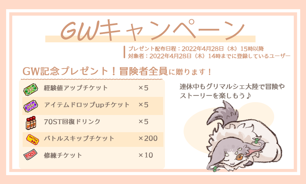 GW期間中にゆっくり『流転のグリマルシェ』をお楽しみいただけるよう冒険者全員にアイテムをプレゼントいたします。