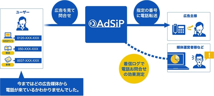 AdSiPは“この電話、どの媒体を見てかけてきたの?"を見える化する電話効果測定サービスです。