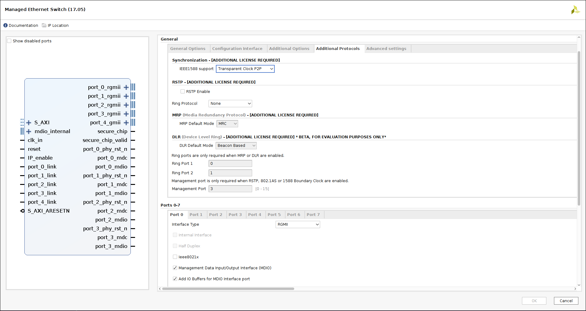 ME SをSoC-e HSR-PRP スイッチ IPと組み合わせて使用すると、必要なポートにHSRおよびPRP機能を導入できます。HSRスイッチングアプローチはカットスルーです。したがって、この組み合わせにより、最大のパフォーマンスと標準との最大の互換性が提供されます。イーサネットPHYデバイスにMII / GMII / RGMIIネイティブインターフェイスを提供し、ザイリンクスIPと組み合わせて、他のインターフェイスの中でRMIIまたはSGMIIをサポートできます。また、MACベースのインターフェイスを備えていない他のIPコアのインターフェイスとして、AXI4-Streamをサポートしています。