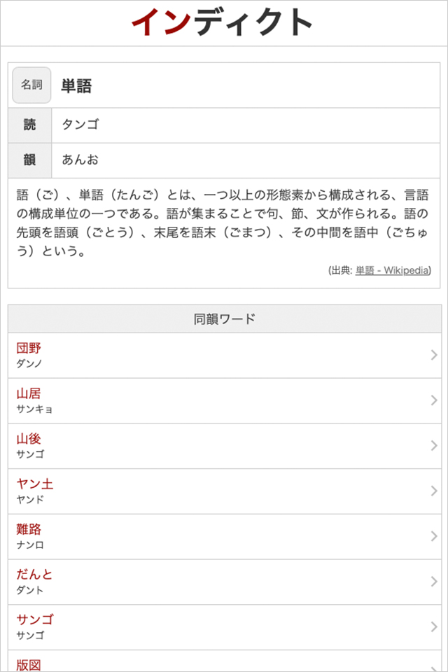 同韻検索では、入力された韻と同じ韻を持つ単語を検索することが可能。