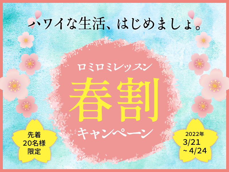 新型コロナウィルスに振り回される日々が続いていますが、いつかは世の中が落ち着き、必ずまた動きはじめます。前とはほんの少し違っている、新しい世の中になるでしょう。クウイポハワイアンロミロミスクールでは、その新しい世の中で自分自身の新しいライフスタイルを始めたいと考える方々を応援するために、ハワイアンロミロミレッスン料10%割引【春割キャンペーン】を実施します。きっと、ハワイアンなライフスタイルに一歩踏み出すチャンスになるはずです。