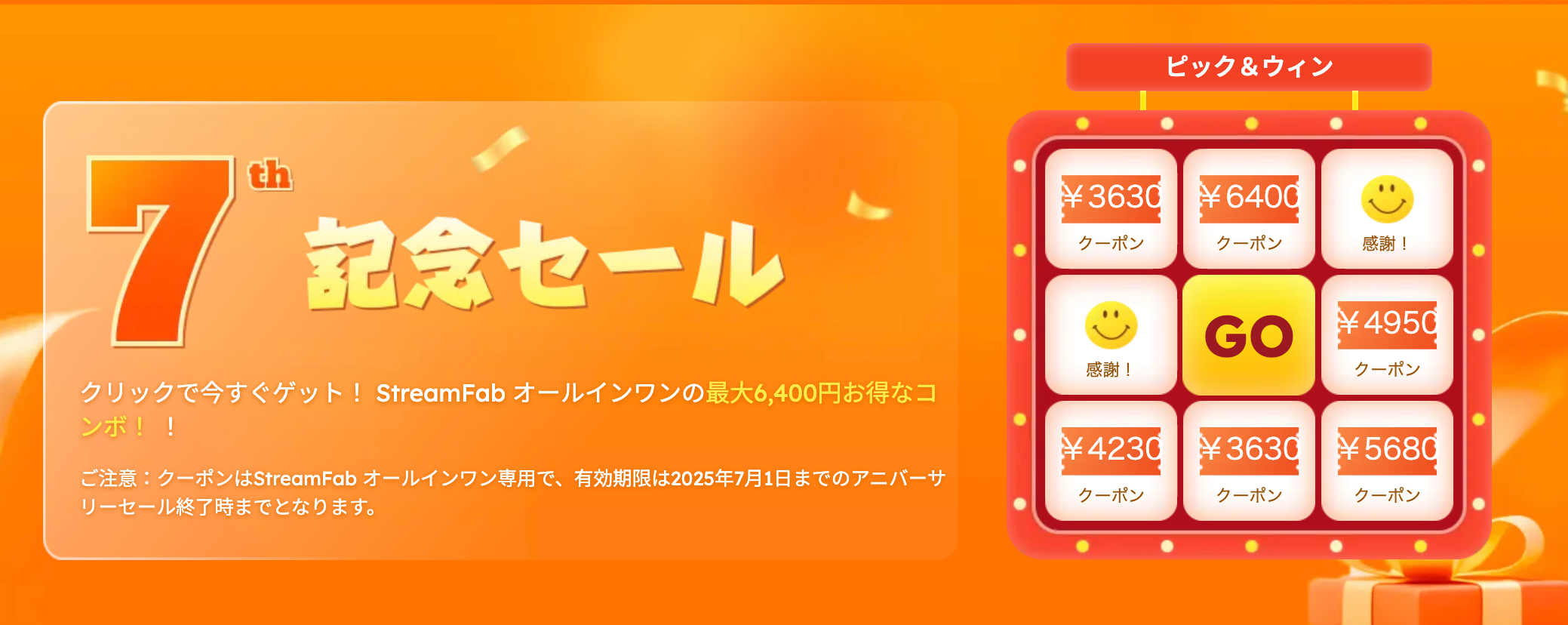 さらに、新規ユーザーはStreamFabのプロモーションページ(StreamFab 7周年プロモーション)でクーポン抽選に参加でき、最大6,400円オフのクーポンを獲得するチャンスがあります。このクーポンはStreamFab All-in-Oneの購入に適用可能です。