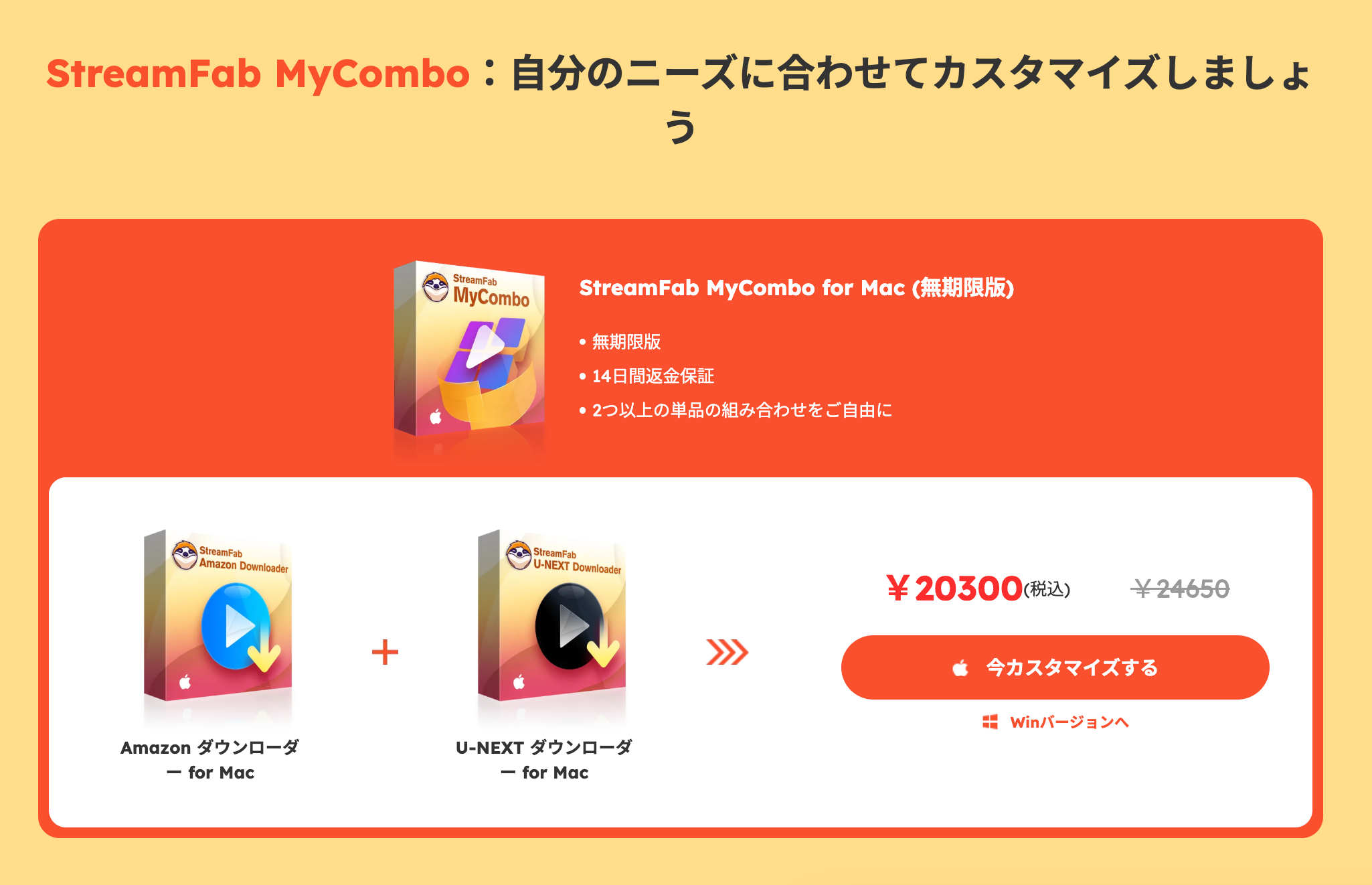 カスタムコンボとして、例えばAmazon + U-NEXT Downloaderが20,300円(通常24,650円)で購入可能。14日間の返金保証付き。