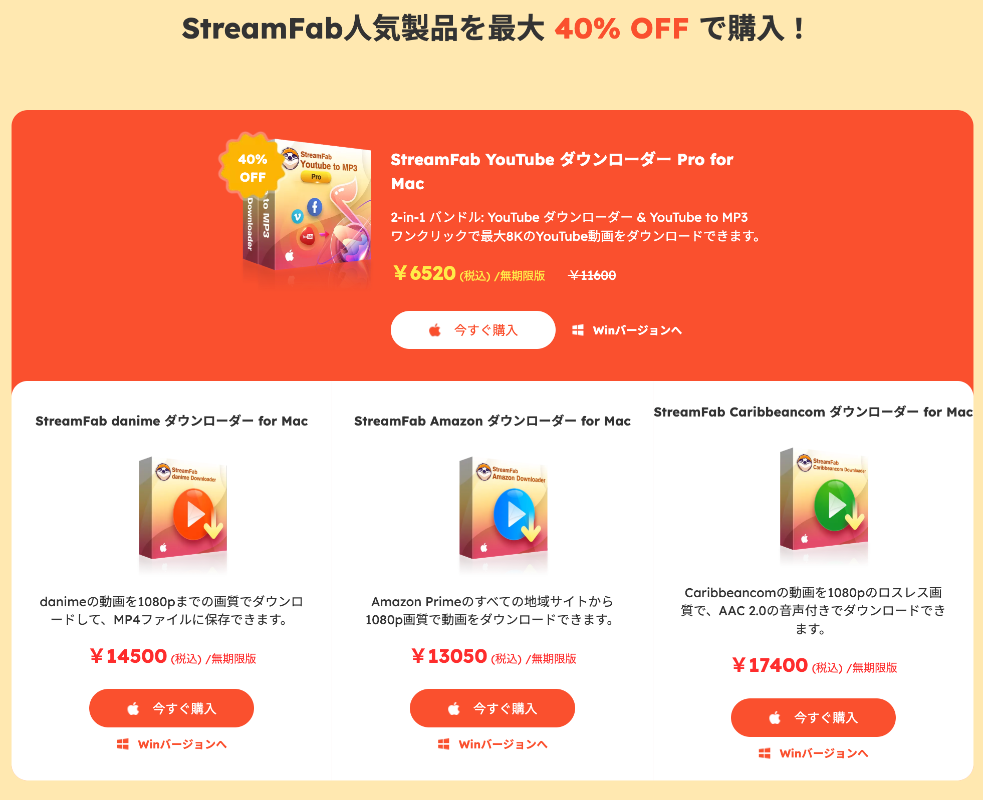 また、StreamFab YouTube ダウンローダー Proなど、人気の単体製品も最大40%オフで提供されます。