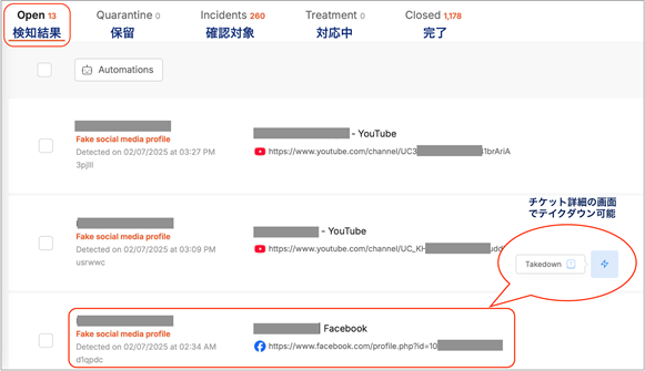 Axurは、数多くのプラットフォーマ―とAPI連携しており、年間50万件以上のテイクダウンを実施しています。WebサイトやSNSでのブランド名やロゴなどの不正使用、フィッシングサイト、偽アプリなどを検知してお客様に通知。お客様は管理画面で「テイクダウンボタン」をクリックするだけで、自動テイクダウンフローが即座に実行されるため、容易に削除できます。
