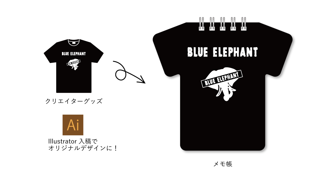 クリエイターがデザインしたロゴやキャラクターをプリントした個性溢れるTシャツが多数販売されています。このロゴやキャラクターデータをアパレル(Tシャツ)から文具(メモ帳)に展開できるクリエイターグッズです。自身のブランドアイテムとして直販することは勿論のこと、メモ帳に展開することでユーチューバーやミュージシャンとコラボレーションしたい広告主(企業)のプロモーションツール、ノベルティーとしても活用しやすくなります。