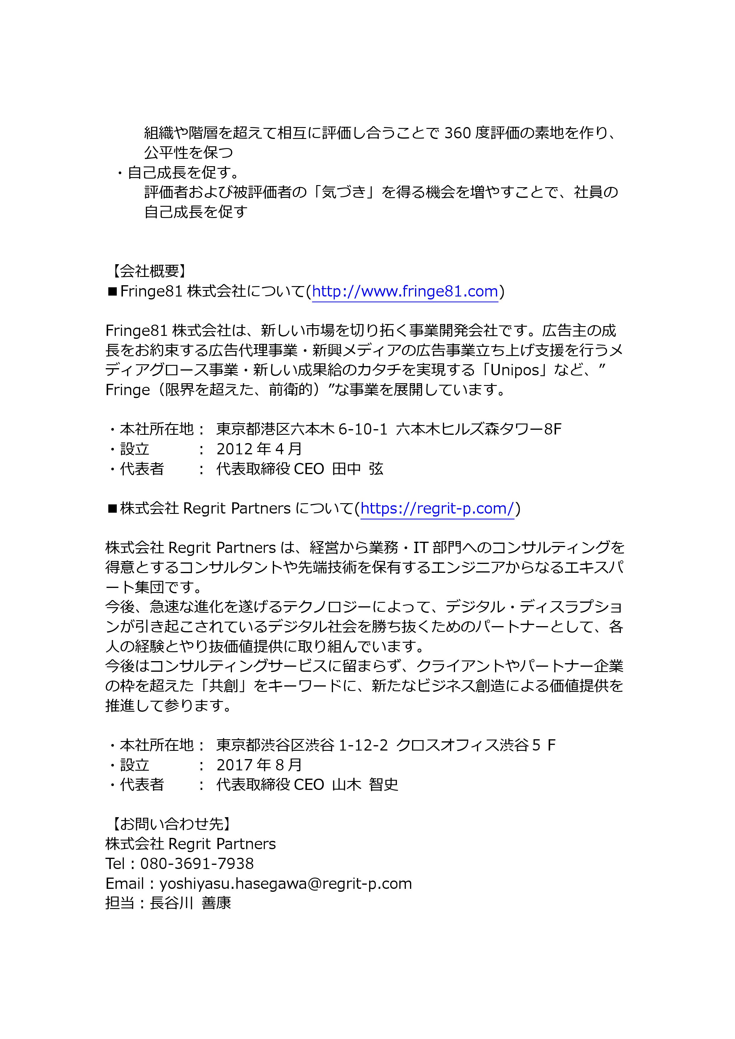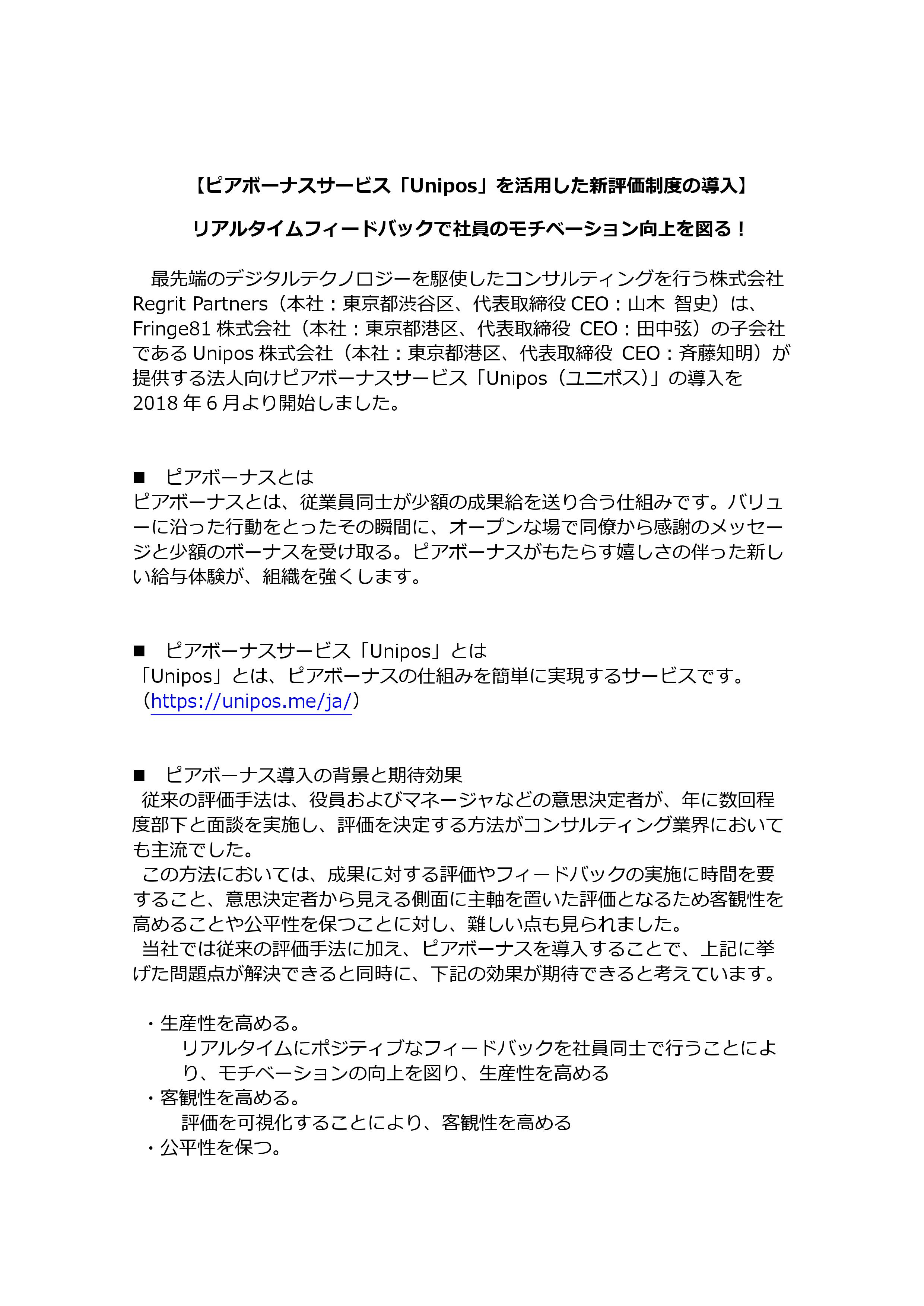 最先端のデジタルテクノロジーを駆使したコンサルティングを行う株式会社Regrit Partners(本社:東京都渋谷区、代表取締役CEO:山木 智史)は、Fringe81株式会社(本社:東京都港区、代表取締役 CEO:田中弦)の子会社であるUnipos株式会社(本社:東京都港区、代表取締役 CEO:斉藤知明)が提供する法人向けピアボーナスサービス「Unipos(ユニポス)」の導入を2018年6月より開始しました。